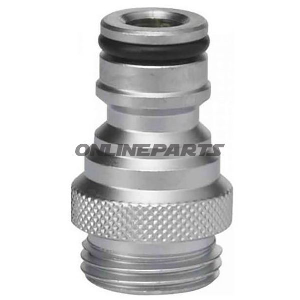 Produkt: Adapter Gardena mit Gewinde 1/2" zur Pistole (Vikan Modell 551.37.01). Dieser Adapter ermöglicht das Anschließen von Gardena-Standardverbindungen an eine Wasserpistole mit 1/2" Gewinde, beispielsweise zur Nutzung mit Vikan Dinga-Wasserpistole.