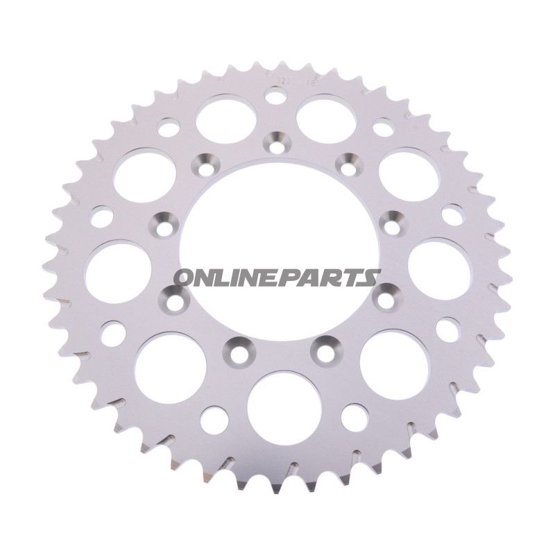 Dieses Alukettenrad ist aus Aluminium gefertigt, was eine gute Kombination aus geringem Gewicht und Haltbarkeit bietet. Aluminium ist bekannt für seine Widerstandsfähigkeit gegenüber Korrosion und Abrieb, was es zu einem idealen Material für Motorradteile macht, die extremen Bedingungen ausgesetzt sind. Die silberne Oberfläche sorgt nicht nur für ein ästhetisches Erscheinungsbild, sondern trägt auch zur Widerstandsfähigkeit des Rades gegenüber den Elementen bei.