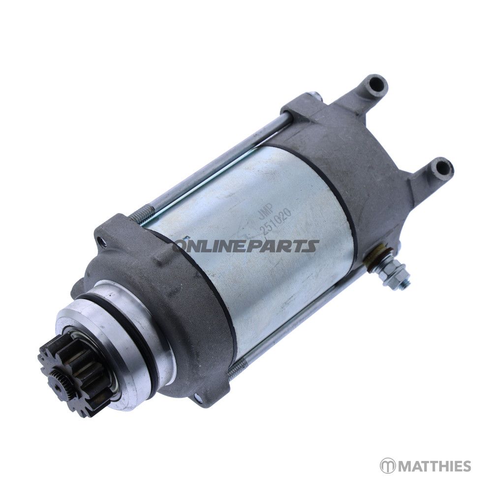 Die Startmotor (Anlasser) ist das elektrische Bauteil, das am Kurbelgehäuse des Motors montiert ist und den Motor beim Start über ein Zahnrad dreht, das mit dem Schwungrad oder Zahnkranz verbunden ist. Wenn der Startknopf betätigt wird, dreht sich der Anlasser gegen den Uhrzeigersinn (von der Achse aus gesehen) und greift mit dem primären Zahnrad (14 Zähne) ein, was den Verbrennungsmotor in Gang setzt.