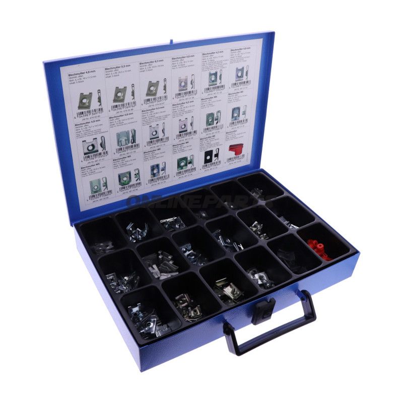 Der Satz wird mit mehreren Typen und Größen von Plattenmuttern geliefert, darunter M4, M5, M6 sowie Varianten, die in mm angegeben sind (z. B. 4,2 / 4,8 / 5,5 / 6,3 / 6,5 mm). Jede Variante hat ihre eigene JMP-Artikelnummer zur Nachbestellung und Identifikation, beispielsweise JMP 479 00 85, JMP 481 01 05 usw. Eine Einsatzeinheit mit 18 Fächern (479 02 24) dient der Sortierung.