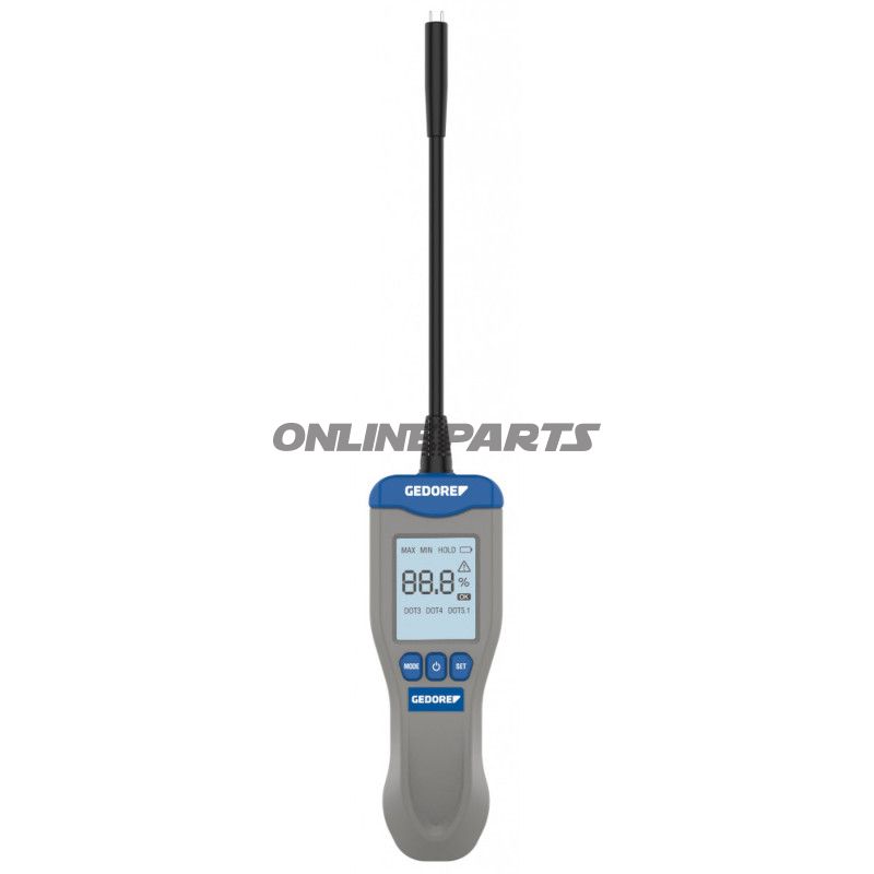 Gedore Automotive Bremsflusstester (GTIN: 4046459199588, MPN: 612.00.71) ist ein handgehaltenes Messgerät, das für die professionelle Kontrolle des Wassergehalts in konventionellen glycolbasierenden Bremsflüssigkeiten (DOT 3, DOT 4 und DOT 5.1) entwickelt wurde. Die Einheit liefert eine schnelle, quantitative Anzeige des Zustand der Flüssigkeit und wird typischerweise in Werkstätten und von erfahrenen Mechanikern verwendet, um zu entscheiden, ob die Bremsflüssigkeit ausgetauscht werden sollte.