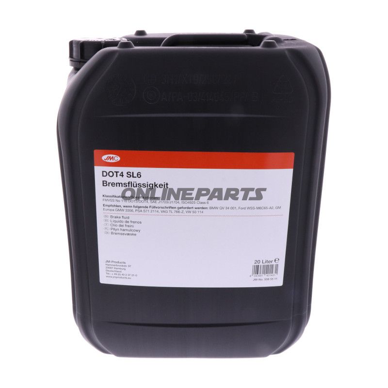 Produktübersicht: JMC Bremsflüssigkeit DOT4 SL6 (GTIN 4043981401431, MPN 558.55.11) ist eine synthetische, niedrigviskose Bremsflüssigkeit für moderne Brems- und Kupplungssysteme. Das Produkt wird in einer 20-Liter-Verpackung geliefert und enthält einen integrierten Ablasshahn für eine einfache Entleerung bei Wartungsarbeiten.