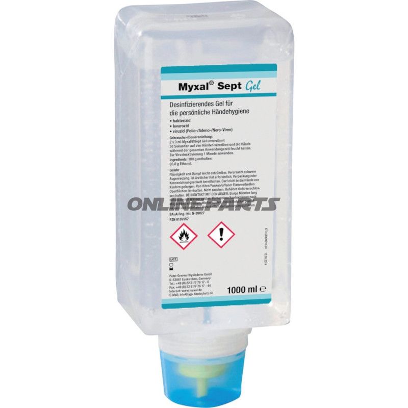 Produkt: Händedesinfektionsgel, 1 Liter, Marke MYXAL SEPT. GTIN: 4260029171839. MPN: 557.19.12.