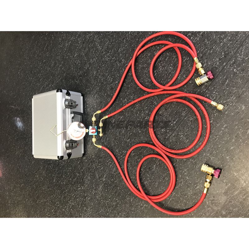 Die Beschreibung richtet sich an Mechaniker und Fachleute in Werkstätten, die Erfahrung mit Druckprüfungen von Klimaanlagen haben und eine robuste, standardkonforme Einheit für gesetzlich vorgeschriebene Dichtheitsprüfungen benötigen.