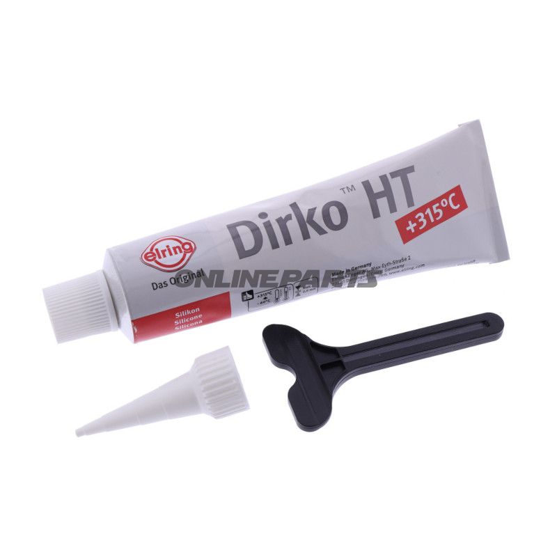 Diese einteilige silikonbasierte Dichtmasse (Dirko HT unter der Elring-Marke) ist für Dicht- und Dichtungsaufgaben entwickelt, bei denen hohe Temperaturenbeständigkeit und permanente Elastizität erforderlich sind. Sie härtet bei Raumtemperatur durch Luftfeuchtigkeit (RTV) aus und bildet eine stabile, pastenartige Fuge mit guter Haftung an herkömmliche Metalle, Gusseisen, die meisten Kunststoffarten (außer PE, PP und PTFE) sowie an Glas.