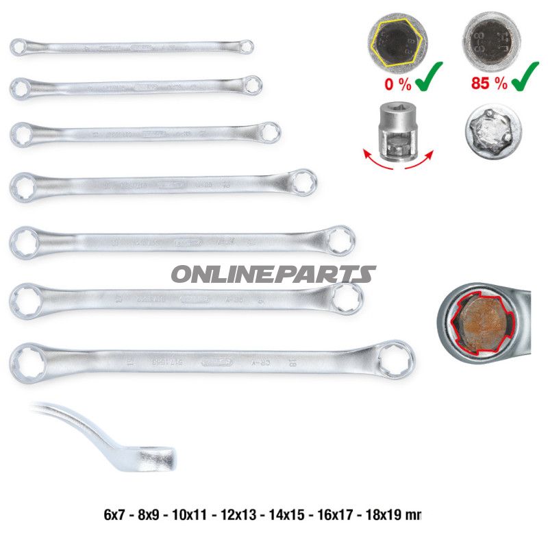 Dieses Set besteht aus sieben gebogenen Doppelringnüssen in den Größen 6/7, 8/9, 10/11, 12/13, 14/15, 16/17 und 18/19 mm. Die Konstruktion ist für Mechaniker und erfahrene Techniker ausgelegt, die häufig auf fest sitzende oder beschädigte Muttern und Schrauben stoßen. Die Ringe sind um 50° gedreht, was besseren Zugang in engen oder senkrecht angeordneten Arbeitssituationen ermöglicht.