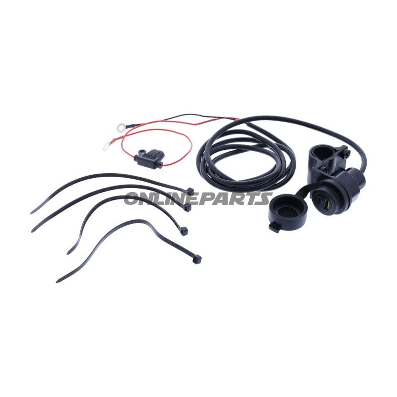 - Doppel-USB-Stecker mit magnetischer Gummidichtung (IP6, wenn Deckel geschlossen ist), Anschlusskabel (~170 cm) und 10 A-Sicherung.