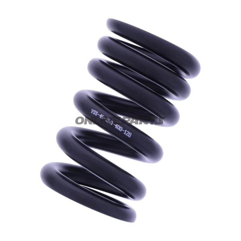 Produktübersicht: Diese schwarze progressive Mono-Feder von YSS (GTIN 8859518056229, MPN 789.38.07) ist für den Einsatz in Stoßdämpferstangen mit einem Innendurchmesser von 46 mm konzipiert. Die Feder ist 120 mm lang und verfügt über eine zweistufigeFedercharakteristik mit angegebenen Federkonstanten von 260 N/mm und 400 N/mm, was ein progressives Verhalten beim Komprimieren zur Folge hat.