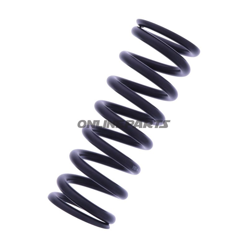 Die Feder besteht aus gehärtetem Stahl, gemäß Industriestandard für Dämpfer-Federkomponenten, um notwendige Elastizität und Ermüdungsfestigkeit bei wiederholten Belastungszyklen sicherzustellen. Die Oberfläche ist schwarz lackiert/coatiert, um Korrosionsschutz zu bieten und Reibung zu den inneren Flächen des Dämpfers zu reduzieren. Die Beschichtung beeinflusst die mechanischen Eigenschaften der Feder nicht wesentlich, verbessert jedoch die Lebensdauer unter normalen Straßen- und Wetterbedingungen.
