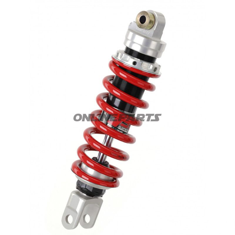 Das Federbein arbeitet als Einzeldämpfer (Mono), wobei die Gasdämpfung eine konstante Dämpfungscharakteristik bei variierender Belastung bietet. Die Vorlade der Feder kann kontinuierlich verändert werden, um die Höhe des Motorrads und die Vorbelastung anzupassen, während die Rebound-Dämpfung über 30 Klicks feinjustiert werden kann, um die Ausrollgeschwindigkeit nach einem Buckel zu kontrollieren. Der Verriegelungsmechanismus für die Feder Vordruck ist mit einer Grubenschraube ausgeführt, und ein Einstellwerkzeug ist enthalten.