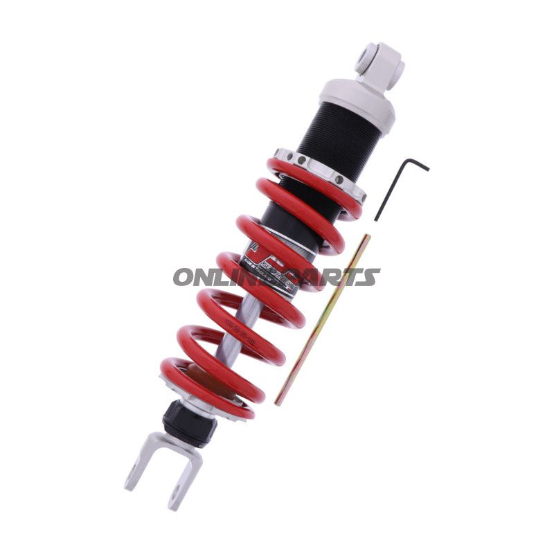 Der Stoßdämpfer hat einen Körper aus gefrästem Aluminium, was eine Kombination aus geringem Gewicht und Haltbarkeit bietet. Er ist mit einer verstellbaren Feder ausgestattet, die sowohl in der Vorspannung als auch im Rückschlag angepasst werden kann, was es dem Mechaniker oder Motorradbesitzer ermöglicht, die Federung basierend auf dem Fahrstil und den spezifischen Bedingungen, unter denen das Motorrad verwendet wird, zu optimieren. Die Einstellung kann mit einem mitgelieferten Werkzeug vorgenommen werden, und die Federvorspannung wird mit einer Grubscrewsicherung fixiert, um Stabilität während der Fahrt zu gewährleisten.