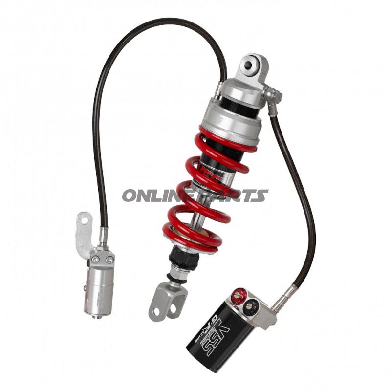 Die Einstellung der Feder-Vorspannung ist praktisch platziert und über einen Schlauch mit dem Stoßdämpfer verbunden, was den Zugang zur Einstellung erleichtert, auch wenn das Motorrad in Betrieb ist. Die Länge des Stoßdämpfers kann um +/- 5 mm angepasst werden, was zusätzliche Flexibilität bietet, um ihn an Ihr spezifisches Motorrad und Fahrstil anzupassen.