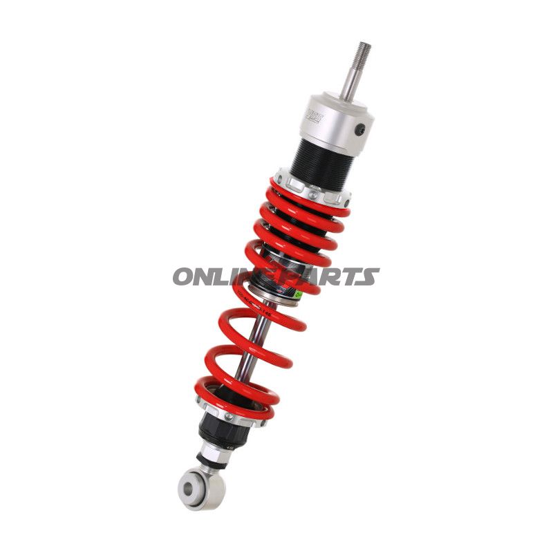 Der Stoßdämpfer besteht aus einem gefrästen Aluminiumgehäuse, das Langlebigkeit und ein geringes Gewicht gewährleistet. Er ist mit einer verstellbaren Feder ausgestattet, die in der Vorspannung und dem Rückschlag um bis zu 30 Klicks angepasst werden kann. Dies ermöglicht es dem Mechaniker oder Motorradbesitzer, die Federung an spezifische Fahrbedingungen oder persönliche Vorlieben anzupassen. Die Federvorspannung wird sicher mit einer Grubenschraube fixiert, was sicherstellt, dass die Einstellungen während des Gebrauchs stabil bleiben.