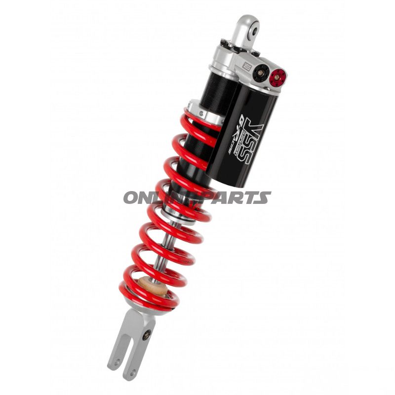 Das Federbein ist mit einem gefrästen Aluminiumgehäuse konstruiert, das sowohl Stärke als auch ein geringes Gewicht gewährleistet. Es ist mit einem Gasdämpfer ausgestattet, der eine reaktionsschnellere und verstellbare Federung bietet. Die Einstellung der Vorspannung, des Rückpralls (30 Klicks) und der Kompression (hoch/niedrig, 30 Klicks) ermöglicht es Mechanikern und Motorradfahrern, die Federung an spezifische Fahrbedingungen und persönliche Vorlieben anzupassen. Die Sicherung der Feder-Vorspannung erfolgt über eine Grubenschraube, was sicherstellt, dass die Einstellungen während des Gebrauchs stabil bleiben.