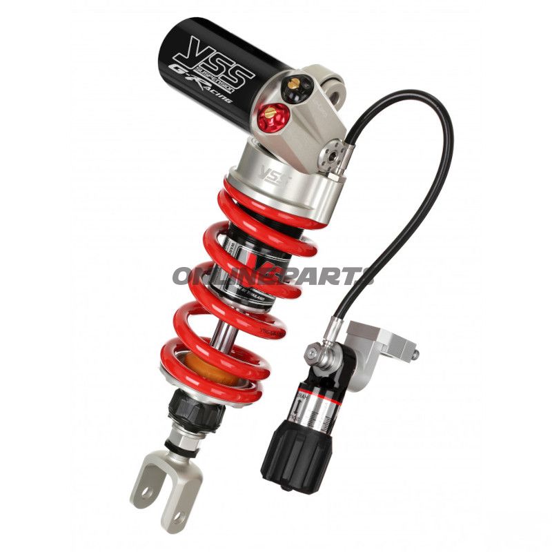 Produktübersicht: YSS Mono-Federbein mit gefrästem Aluminiumgehäuse, Gasdämpfer und externem Reservoir. Wird als einzelner Hinterdämpfer (Oberauge / Untergabel) montiert und bietet hydraulische Federvorspannung über einen Fernschlauch, dreistufige Dämpfungsanpassung (Wiederholung, Kompression hoch/niedrig) sowie Feineinstellung ±5 mm. GTIN: 8859253911821, MPN: 789.53.56, Hersteller: YSS.