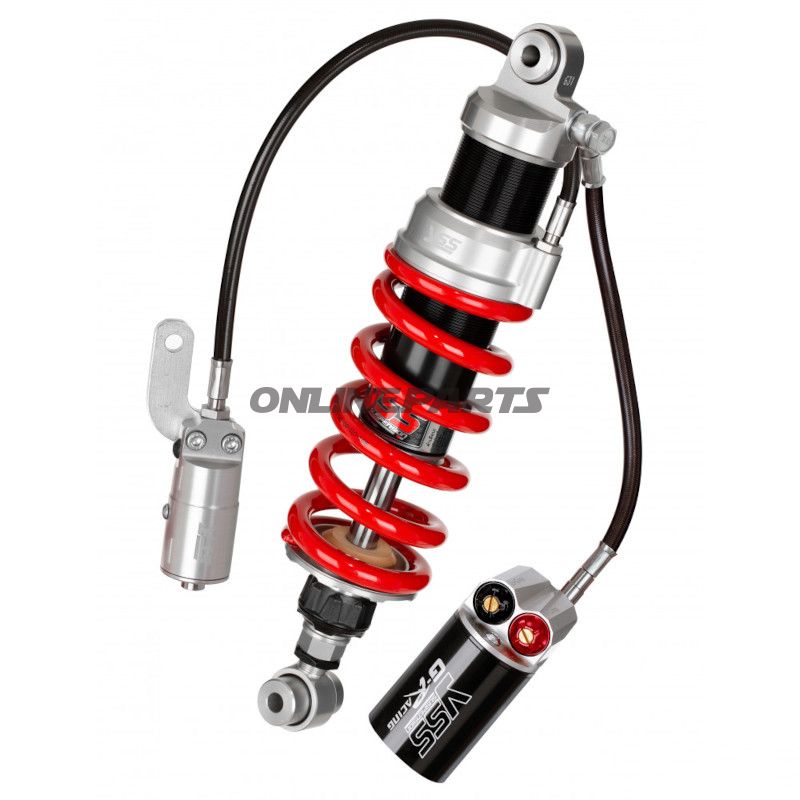 Der Federbein ist mit einem gefrästen Aluminiumgehäuse konstruiert, was eine solide und leichte Lösung gewährleistet. Er bietet Einstellmöglichkeiten in der Feder-Vorspannung, dem Rückschlag (30 Klicks) und der Kompression (hoch/niedrig 30 Klicks), was es Mechanikern und Motorradbesitzern ermöglicht, die Federung an spezifische Fahrbedürfnisse anzupassen. Die Sicherung der Feder-Vorspannung erfolgt über eine Grubscrews, was eine stabile Einstellung während der Fahrt gewährleistet.