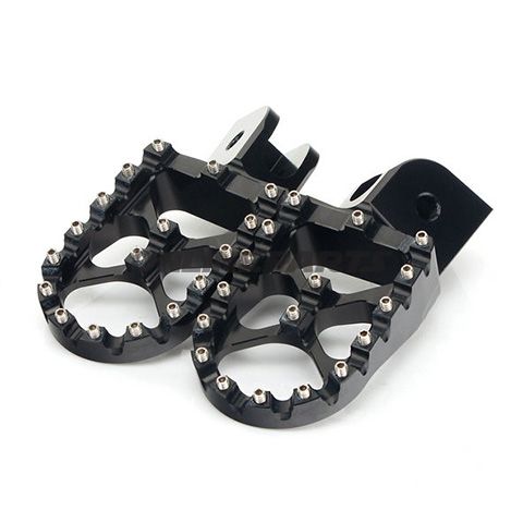 Die Fußrasten bestehen aus langlebigen Materialien, die dafür ausgelegt sind, Abnutzung und Einflüsse durch das Fahren im Gelände zu widerstehen. Das schwarze Finish sorgt nicht nur für ein elegantes Aussehen, sondern ist auch korrosions- und kratzfest, was sicherstellt, dass die Fußrasten über die Zeit in gutem Zustand bleiben. Es ist wichtig, die Fußrasten sauber zu halten, um optimalen Kontakt und Grip zu gewährleisten, was das Fahrerlebnis und die Sicherheit verbessern kann.