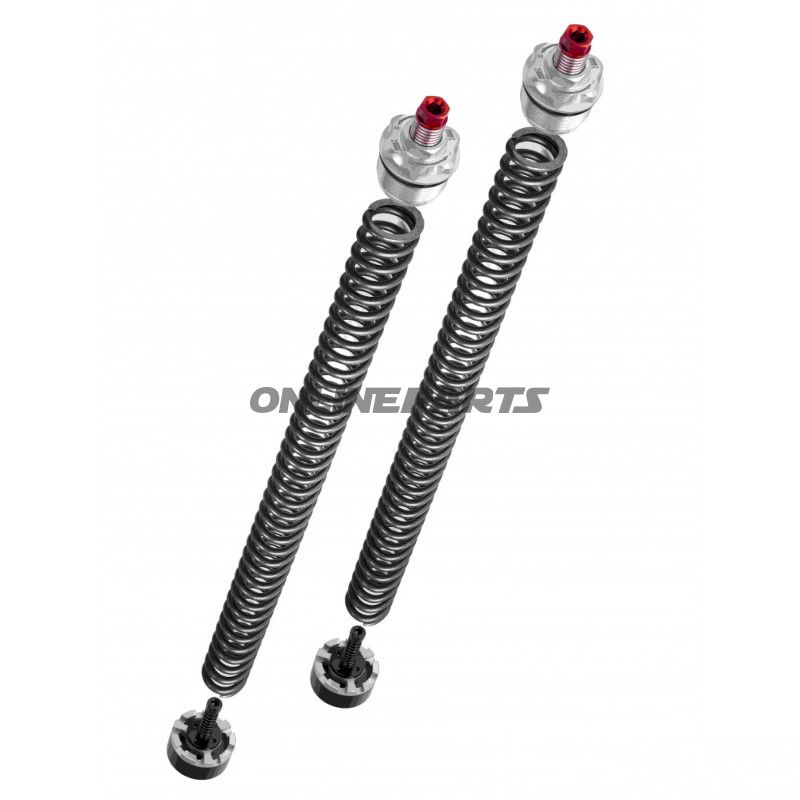 Dieser Gabel-Aufrüstungssatz von YSS ist darauf ausgelegt, die Federungseigenschaften der Gabel zu verändern, ohne umfangreiche Demontage oder innere Modifikationen vorzunehmen. Der Satz enthält eine festere Gabelfeder und eine einstellbare Gabelrohrabdeckung, und bei konventionellen Gabeln ist ein Gabelventil enthalten. Für umgekehrte (USD) Gabeln mit technischen Einschränkungen wird das Ventil nicht geliefert, da es nicht montiert werden kann.