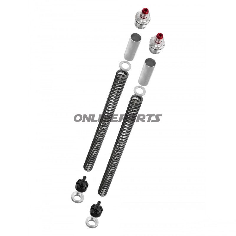 - Das Set enthält eine festere Gabelfeder und eine verstellbare Gabelrohrabdeckung, die eine externe Einstellung der Federvorpannung über eine zugängliche Verstellschraube ermöglicht.