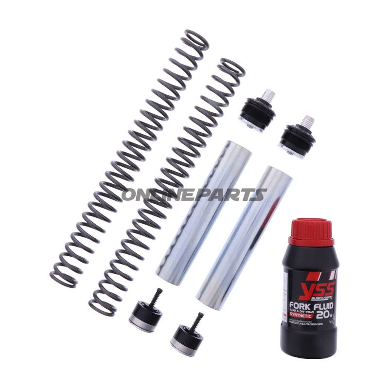 Das YSS Gabel Upgrade-Kit ist darauf ausgelegt, den Straßenkontakt und das Handling Ihres Motorrads zu verbessern. Dieses Set enthält eine festere Gabel-Feder sowie eine verstellbare Gabelrohrkappe, die eine Feinjustierung der Feder-Vorspannung ermöglicht. Für Fahrzeuge mit konventioneller Gabel ist auch ein Gabelventil enthalten, während dies aus technischen Gründen für umgekehrte Gabeln nicht möglich ist.
