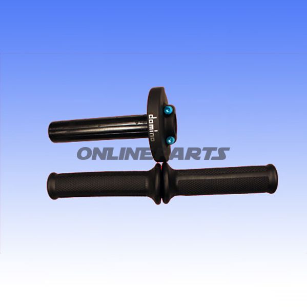 Die Schrauben und äußeren Metallteile bestehen aus eloxiertem Aluminium, was Korrosionsschutz und eine moderate abriebfeste Außenfläche ohne Sprödigkeit bietet. Die Anodisierung verbessert auch die Oberflächenhärte und verringert das Risiko von Ätzungen, wo Bauteile Witterung und Fett ausgesetzt sind. Die interne Drehmechanik und die Achse des Gashandgriffs sind für mechanische Funktion ausgelegt; der Griff selbst ist mit schwarzen Gummigriffen (Grips) mit Domino-Logo versehen. Das Gummi ist darauf ausgelegt, Halt und Dämpfung von Vibrationen zu bieten, aber mit der Zeit bei intensivem Gebrauch normale Abnutzung zu erwarten.