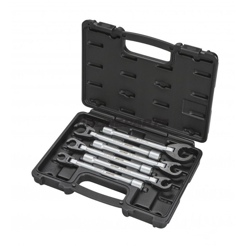 Gedore Automotive Gelenk-Ringschlüsselsatz (MPN: 604.01.31, GTIN: 4046459198284) ist für Monteure konzipiert und für Arbeiten mit Kabel- und Ventilverbindungen vorgesehen, bei denen der direkte Zugang eingeschränkt ist. Der Satz kombiniert ein extra langes offenes Schraubenschlüsseldesign mit einem drehbaren Gelenk, sodass Kabelfittings in engen Bereichen gelöst und festgezogen werden können, ohne umliegende Bauteile entfernen zu müssen.