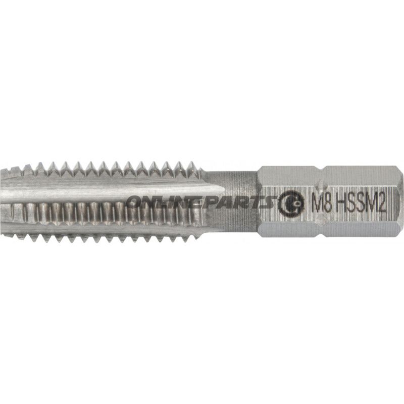 Dieses Gewindebohrerstift (Tapfbits) ist vorgesehen für die Herstellung eines M8 x 1,25 Innengewindes in vorgebohrten Löchern unter Verwendung eines 1/4" sechskantigen Drehhalters. Das Produkt ist ein klassischer HSS‑G (M2) Tapfbits, konzipiert für den Einsatz in Stahl und anderen gängigen Metallmaterialien, bei denen eine schlupffreie und präzise Gewindebildung mit Hand- oder Maschinenantrieb erforderlich ist.