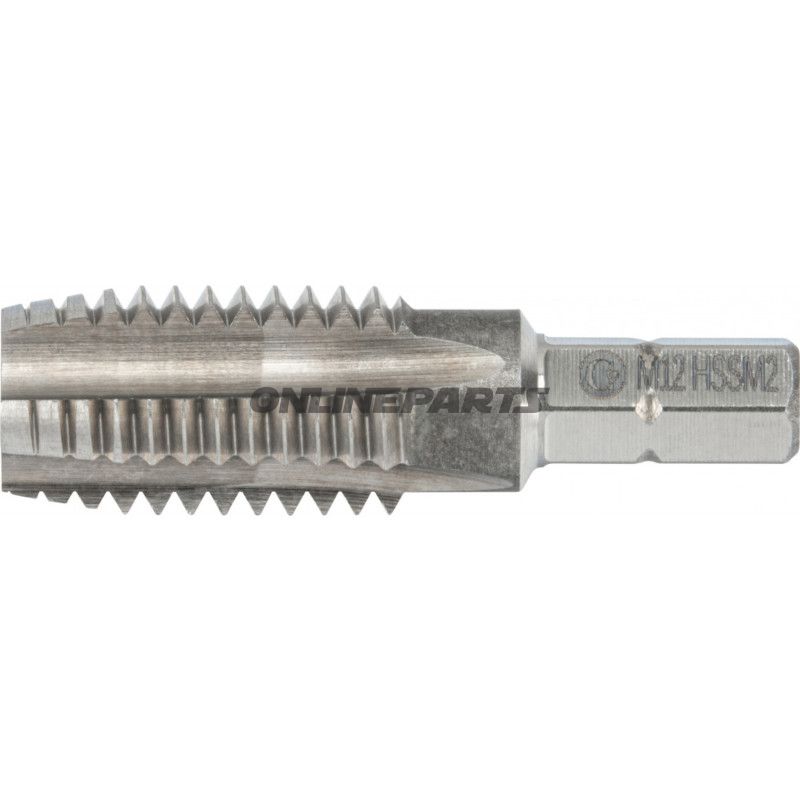 Dieser Gewindebohrer (tap bit) ist für den direkten Einsatz in Bohrmaschinen oder Schraubautomaten mit 1/4" Sechskantaufnahme vorgesehen und darauf ausgelegt, M12-Gewinde in Materialien zu schneiden, bei denen eine HSS-G M2-Klasse passend ist. Das Produkt wird mit der MPN 637.01.14 und der globalen Artikelnummer (GTIN) 4037374396589 identifiziert.
