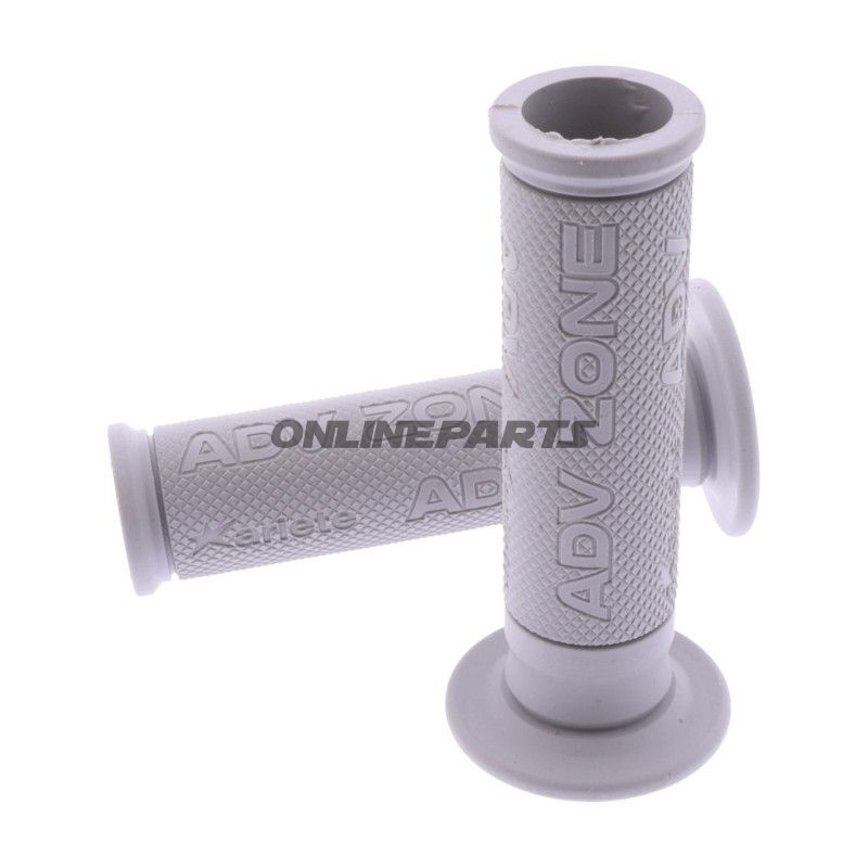 Produkt: Gummigriff Adventure in hellgrau von Ariete (MPN: 729.05.25, GTIN: 8054145174951). Dies ist ein offenes Griffdesign für Standardlenkerdurchmesser von 22 mm und 24 mm, mit variierendem Innendurchmesser zwischen linker und rechter Seite.