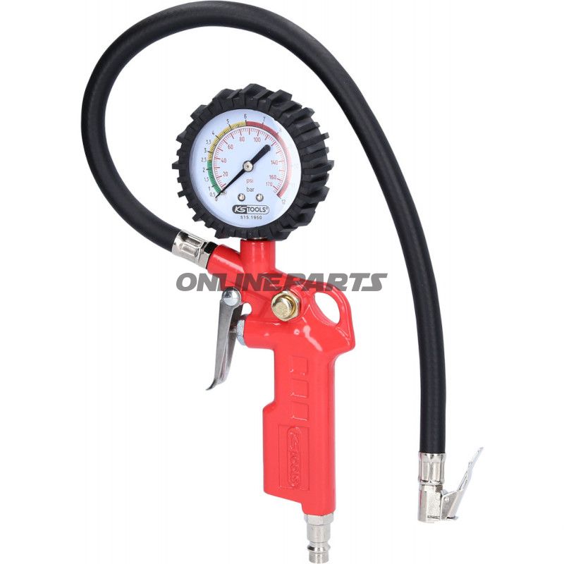 Handreifenfüller KS Tools 515.1950 Reifendruckmesser 0–11 bar, analoge Anzeige, 1/4" PT Anschluss og 490 mm Schlauch. Gummibeschichtetes Gehäuse med Befüllungshebel und Ablassknopf.