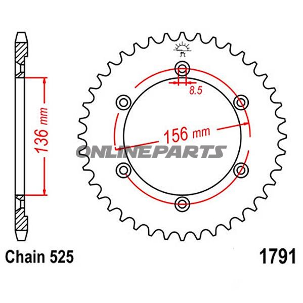 Das Kettenrad besteht aus hochwertigem Stahl und ist darauf ausgelegt, den anspruchsvollen Bedingungen standzuhalten, denen Motorräder häufig ausgesetzt sind. Mit 46 Zähnen und einer Teilung von 525 sorgt es für eine reibungslose und effiziente Kraftübertragung. Der präzise Lochkreis von 156 mm und 6 Senkschrauben garantieren eine sichere und stabile Montage am Hinterrad des Motorrads.