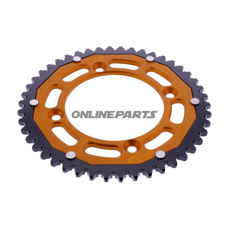 Das Zahnrad besteht aus einem Dual-Material, das Stärke und geringes Gewicht kombiniert, was entscheidend ist, um Haltbarkeit zu gewährleisten, ohne die Leistung des Motorrads zu beeinträchtigen. Die orange Farbe verleiht nicht nur eine ästhetische Note, sondern macht das Zahnrad auch sichtbar und leicht zu identifizieren während der Wartung.