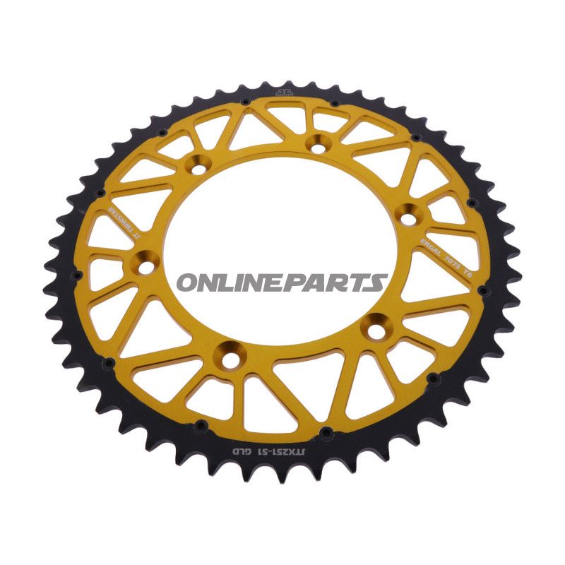 JT Twinstar 51Z Kettentrieb ist ein Stahl/Aluminium-Hybrid-Zahnrad, das entwickelt wurde, um optimale Leistung und Haltbarkeit für Ihr Motorrad zu bieten. Dieses Zahnrad wurde speziell entwickelt, um leicht zu sein, während es die notwendige Stärke und Abriebfestigkeit für anspruchsvolles Fahren bietet.