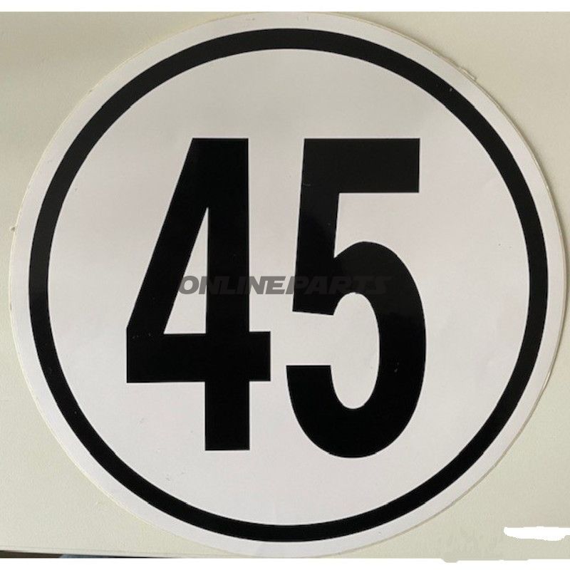 Kurzfassung: Kurzes, selbstklebendes PVC-Folieschild Ø 200 mm mit weißem Hintergrund und schwarzen Zahlen/Texten markiert die Geschwindigkeit 45 km/h. Geeignet für sichtbare, flache Montageflächen, an denen eine kompakte und deutliche Markierung gewünscht wird.