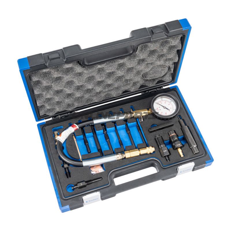 Dieses Kompressionstestsatz ist für Mechaniker und Motorroller-Besitzer gedacht, die den Kompressionsdruck in Dieselmotorzylindern messen müssen. Der Satz misst bis zu 70 bar und ist so zusammengestellt, dass er die gängigsten Anschlussarten an Dieselmotoren mit Glühkerzen bzw. Einspritzdüsen abdeckt.