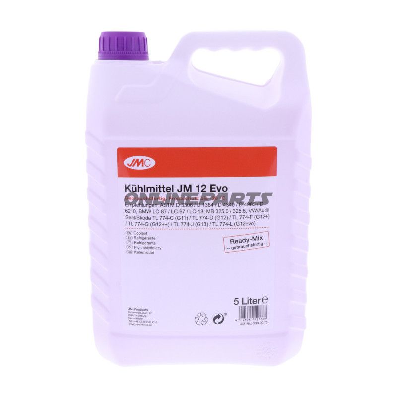 Produkt: Kühlmittel JM 12 EVO, fertig gemischt in einer 5-Liter-Verpackung. Markenname JMC (GTIN: 4043981427660, MPN: 530.00.75).