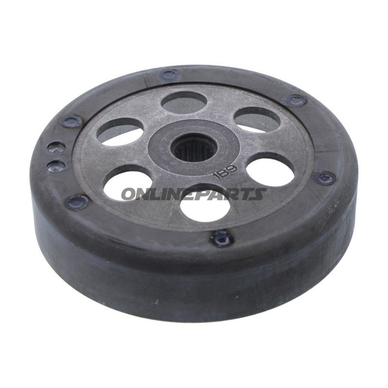 - Die Kupplungsglocke sitzt auf der Hinterradachse/sekundären Achse in der primären Antriebsstrang innerhalb des Variatordeckels (Getriebeabdeckung) bei Scootern mit CVT.