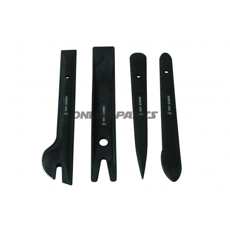 Dieses Lösungssatz besteht aus vier profilierten Werkzeugen, die speziell für die sichere Entfernung und Demontage von Verkleidungen, Clips und geklebten Zierleisten an Hybrid- und Elektrofahrzeugen (Hochvolt-Fahrzeugen) entwickelt wurden. Das Set richtet sich an professionelle Mechaniker und erfahrene Motorradfahrer, die mit elektrifizierten Fahrzeugen arbeiten und isolierte Werkzeuge benötigen, wenn sie in der Nähe von Hochspannungskomponenten arbeiten.