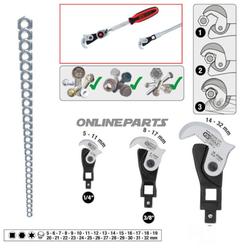 Das Produkt ist ein 3-teiliges Multifunktionsschlüssel-Set von KS Tools (MPN: 604.02.28, GTIN: 4069465008941) für professionelle Anwendungen beim Demontieren, Montieren und Warten von Schrauben, Rohren und Achsen. Das Set kombiniert einen automatischen Anpassungsmechanismus mit einer integrierten Abstoßfunktion, sodass dasselbe Werkzeug auf eine Reihe verschiedener Profile und Größen angewendet werden kann.