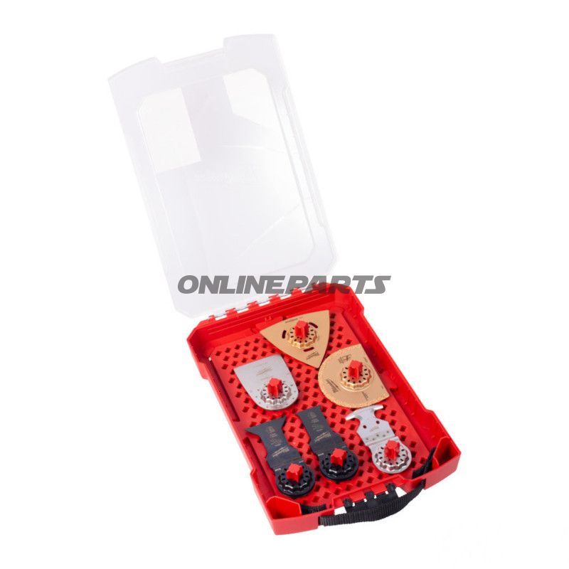 Das Set wird als 8-teiliges Multifunktionswerkzeugzubehörset geliefert: zwei 28 mm Tiefschnitt-Sägeblätter, zwei 43 mm Tiefschnitt-Sägeblätter, ein 2,2 mm Blatt mit Hartmetallspitze, ein Standardblatt, eine Karbidraspel und ein 52 mm flexibler Spatel. Das Produkt wird unter Milwaukee, MPN 685.06.46 und GTIN 045242600649 vermarktet.