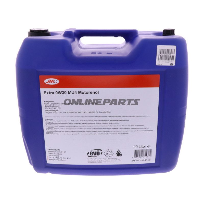 Produkt: JMC Motoröl 0W-30 MU4, 20 Liter. GTIN: 4043981414332. Hersteller-Teilenummer (MPN): 558.40.09. Die Marke JMC ist in den technischen Daten und Zulassungen des Herstellers angegeben.