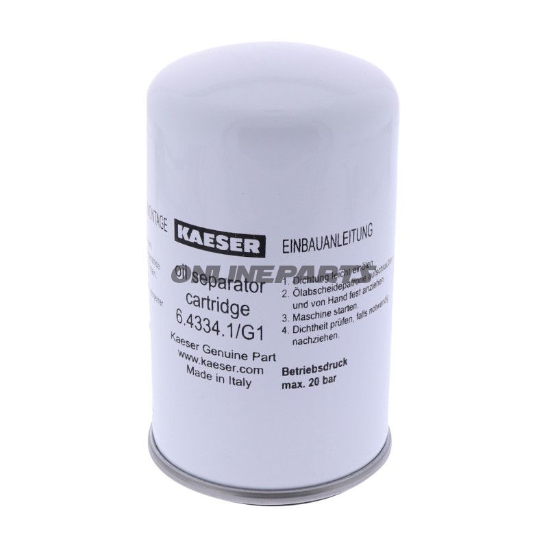 Produkt: Kaeser Ölabscheiderpatrone (Originalteilnummer 6.4334.1, MPN 656.04.89). Diese Patrone ist für die Trennung von Öl aus Druckluft in Schraubenkompressoren konzipiert und wird verwendet, wenn Kaeser-kompatible Elemente erforderlich sind.