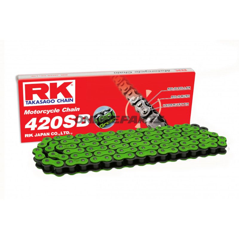 Produkt: RK Standardkette in grünem Ausführung (Typ 420 SB). Dies ist eine offene Kette ohne O-Ring, geliefert pro Kettenglied (Meterpreis). RK steht als Hersteller und ist mit MPN 725.09.77 sowie GTIN 9555217627140 angegeben.