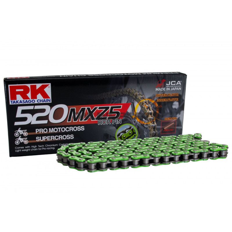 Produkt: RK 520 MXZ5 Standardkette in Grün/Schwarz (GTIN: 4935531507093, MPN: 725.08.34). Diese Kette wurde von der Marke RK für die Anforderungen im Bereich Supermoto und Motocross entwickelt, insbesondere für Leichtbau- und Mittelklasse-Maschinen im Bereich 125–500 ccm.