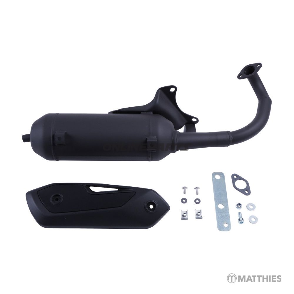 - Der Auspuff ist aus Materialien gefertigt, die für leichte Scooter-Auspuffanlagen geeignet sind (Stahl/Legierungen mit korrosionsschützender Oberfläche). Die Oberflächenbeschichtung in Schwarz reduziert sichtbare Korrosion und sorgt für ein einheitliches visuelles Erscheinungsbild.