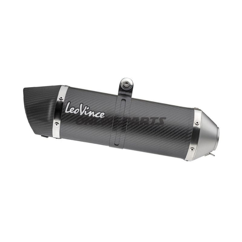 Die Hülle und die Endkappe sind aus hitzebeständigem Carbonfaser gefertigt, was das Gewicht im Vergleich zu Metallschalen reduziert und eine hohe Hitzebeständigkeit im Bereich der Endkappe bietet. Geschweißte Verbindungen an Metallteilen sind mit TIG-Schweißen ausgeführt, das präzise und langlebige Verbindungen gewährleistet. Die inneren Schalldämpferkomponenten (Einsatz, Dichtungen und eventuell perforierter Kern) folgen den Designprinzipien von LeoVince für das Gleichgewicht zwischen Dämpfung und Durchfluss; die Halterungen zur Montage sind ebenfalls verstärkt und teilweise mit Carbon-Elementen ausgeführt, um die Wärmeübertragung auf den Rahmen zu minimieren.