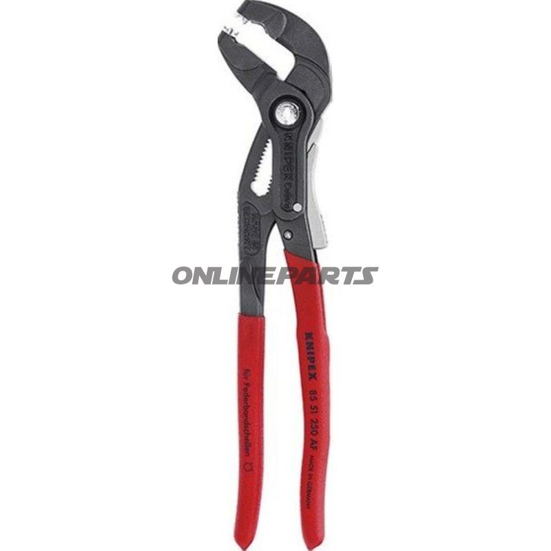 Zange Knipex 85 51 250 AF Federbandschellenzange til klem. Max Maulöffnung 80 mm, Federbandring bis 70 mm, Länge 250 mm, Feinverstellung og drehbare Greifeinsätze.
