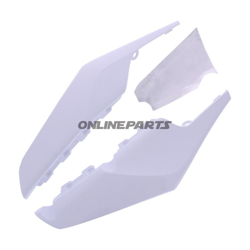 Die Seitenverkleidungen bestehen aus langlebigen Materialien, die einen langanhaltenden Schutz vor Abnutzung und Schäden gewährleisten. Das Material ist leicht, aber stark, was es ermöglicht, den Belastungen standzuhalten, die beim Fahren, insbesondere in Offroad-Situationen, auftreten. Die weiße Farbe verleiht zudem ein sauberes und stilvolles Aussehen, das mit verschiedenen Farbschemata des Motorrads kombiniert werden kann.