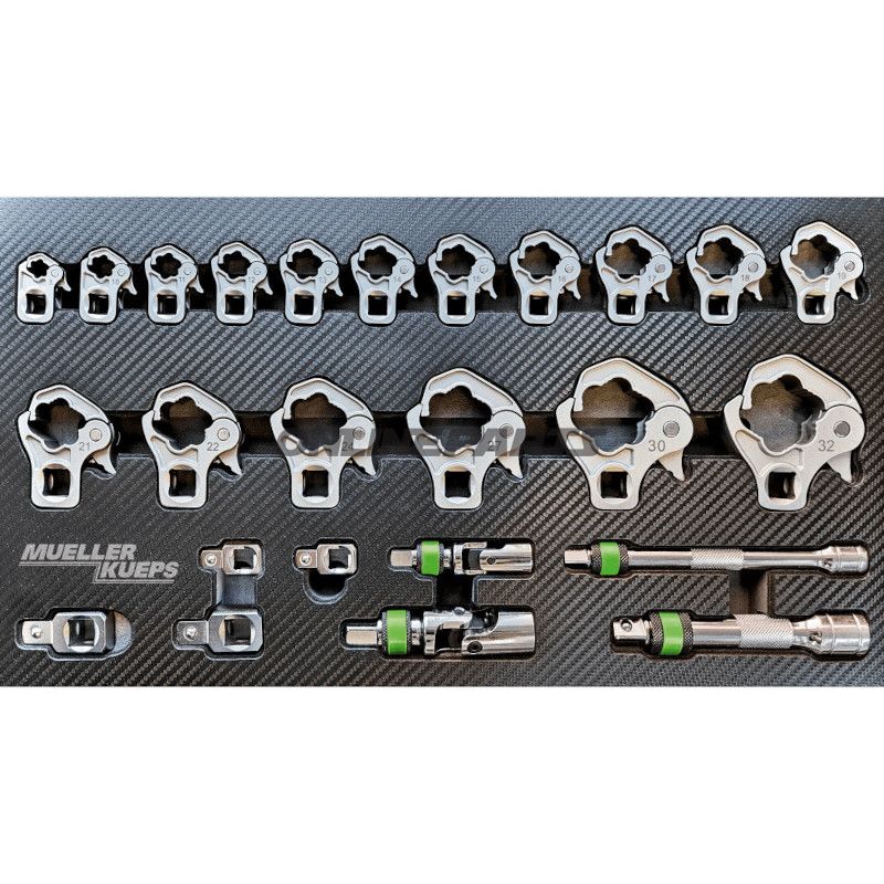 Produkt: Sensor- und Kabelschlüssel-Set von Müller Werkzeuge (MPN: 605.08.79). Dieses Set enthält Spezialwerkzeug, das für den Ausbau und die Montage von Sensoren, Leitungsverbindungen und entsprechenden Fittings im Größenbereich 8–32 mm entwickelt wurde.