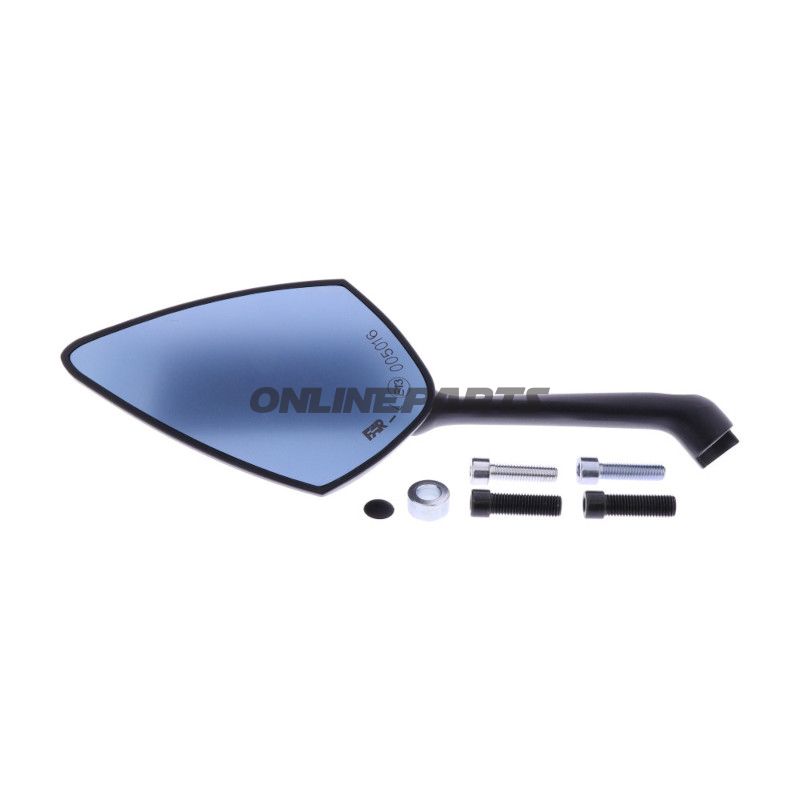Dieser Spiegel wurde entwickelt, um eine verbesserte Seitenansicht von der linken Seite durch eine längere Montagesarm-Anordnung zu ermöglichen, wobei sich die Spiegelposition typischerweise weiter vom Fahrer entfernt befindet als Standardspiegel an der Verkleidung oder dem Schlitten. Die Form ist rhombusförmig, was ein relativ breites Sichtfeld mit schlankem Profil kombiniert, um Luftwiderstand und Konflikte mit Schmutz oder Kleidung zu reduzieren. Der Spiegel ist E-gekennzeichnet, was bedeutet, dass er den relevanten Zulassungen für den Straßenverkehr in Europa entspricht.